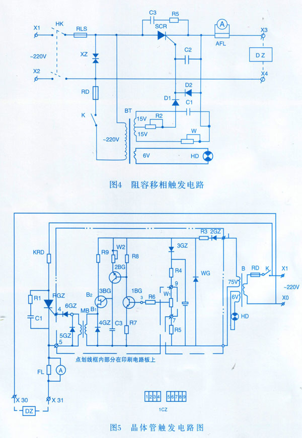 圖4所示為阻容移相角撥電路原理圖,圖5所示為晶體管觸發電路原理。其它如需各種 形式的自動控制電控箱,可按要求制作。七、隨機技術文件